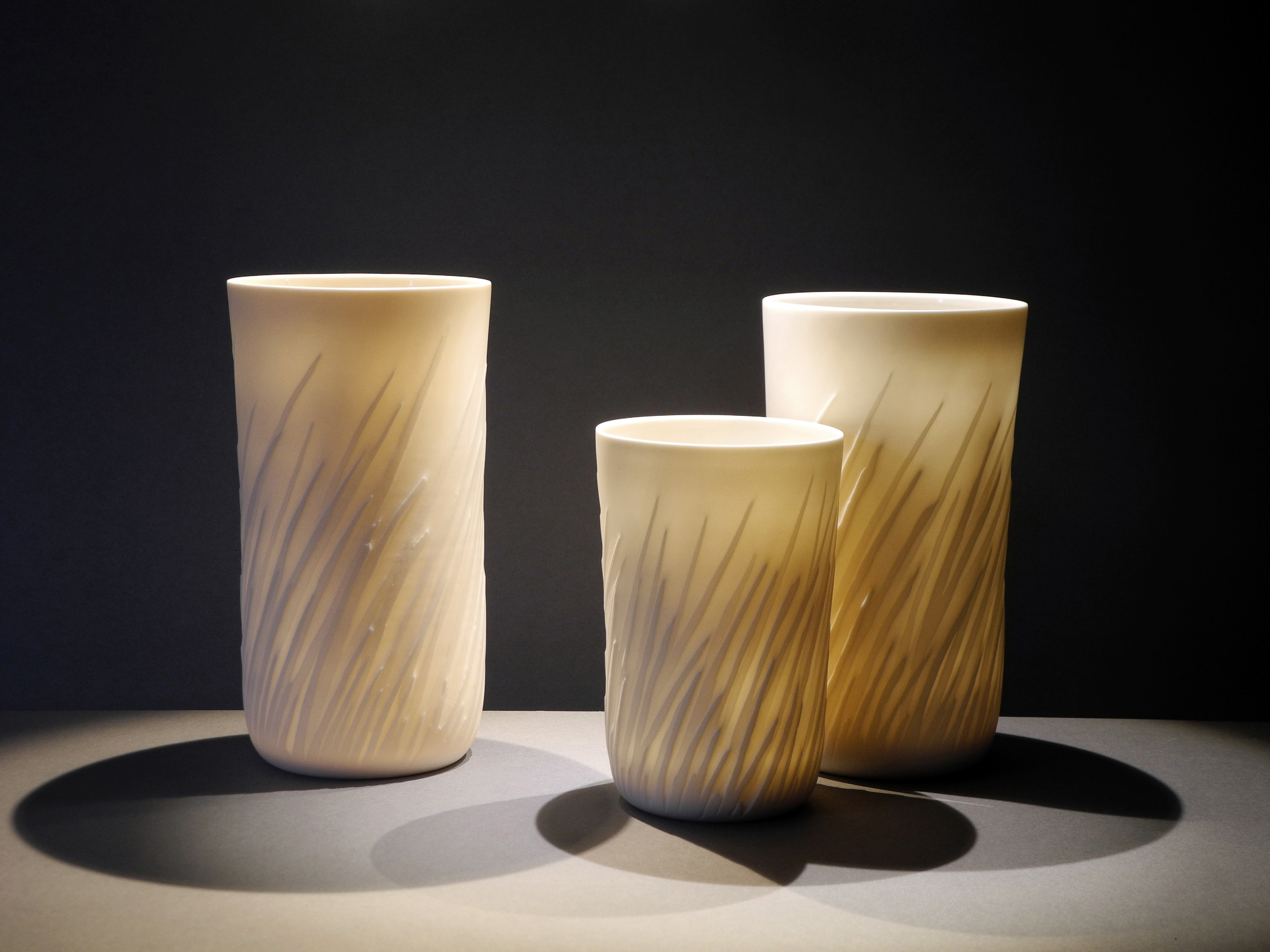 Three ‘Grasses’ thrown and water-etched porcelain vases.