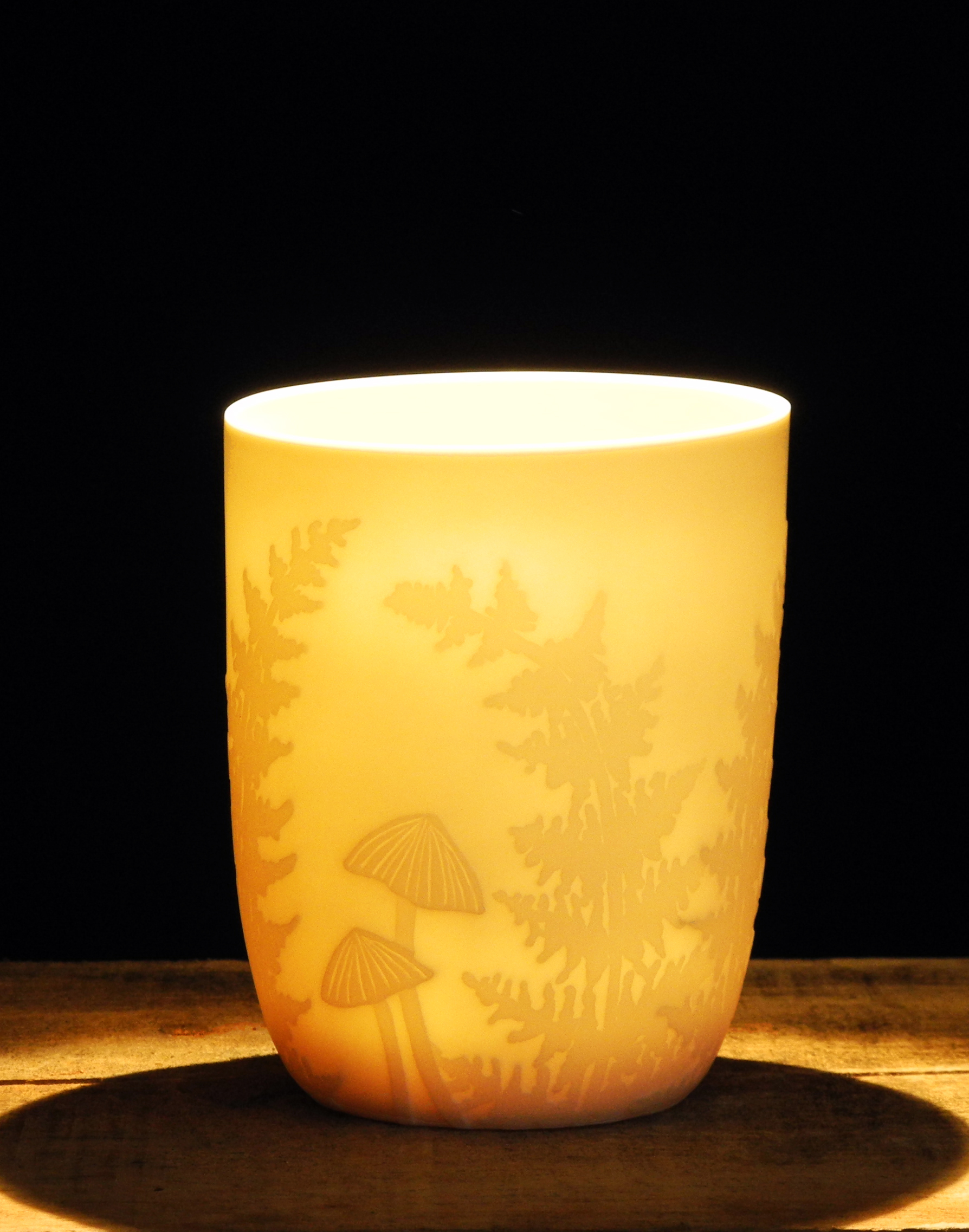 ‘Ferns & Fungi’, hand thrown and water-etched porcelain.